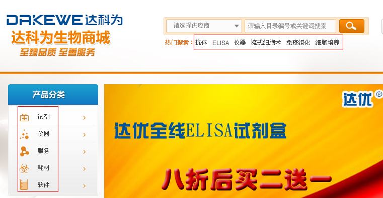 在生物城首頁可以點擊“產(chǎn)品目錄”,或者進(jìn)入生物商城,通過分類或者搜索來查找產(chǎn)品