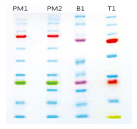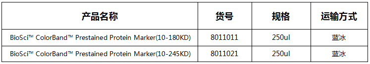 BioSciTM ColorBandTM Prestained Protein Marker產(chǎn)品應(yīng)用于SDS-PAGE凝膠電泳時,可實(shí)時監(jiān)測蛋白樣品的分離情況,也可以用于評估Western轉(zhuǎn)膜(PVDF、尼龍或硝酸纖維素膜)效率,并粗略的估計蛋白樣品的分子量。