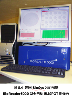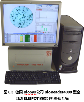 德國Bio-Sys公司從上世紀80年代開始就致力于生物圖像識別領域,在進入ELISPOT圖像分析儀市場后一直以其先進的ELISPOT斑點識別技術聞名。德國Bio-Sys公司首先解決了顯微攝像系統(tǒng)難以定位96孔板上的每一個孔的問題。其解決方法基于圖像識別技術,利用板孔邊壁和真正的孔底的細微差別,在機械定位的基礎上,通過軟件識別來進一步提高每孔的定位精度。是目前市場上所有ELISPOT圖像分析儀中唯一能夠完整識別整個孔底ELISPOT斑點圖像的設備。在對真假斑點的分辨中,德國Bio-Sys公司除了具備完善的物理學多參數識別技術,還特別針對ELISPOT斑點形成的生物學過程,通過細胞因子顯色后的“光密度”峰值積分分析方法,精確分辨真假斑點、融合斑點等復雜情況。Bioreader系列ELISPOT圖像分析儀國外大多數較有經驗的ELISPOT實驗室推崇的特點為:專業(yè)性和參數全開放性。因為ELISPOT實驗的復雜性,ELISPOT斑點形成在不同的實驗條件下有非常大的差異。這就對ELISPOT圖像分析儀提出了較高的要求:既要能夠保證斑點計數的真實性和一致性,又要能夠根據不同情況,通過實驗者的判斷來校正儀器對ELISPOT斑點識別的標準。要同時實現(xiàn)以上兩個要求,唯一的辦法是將儀器的所有判斷標準向ELISPOT實驗者開放,實現(xiàn)實驗者和儀器的互動。在這一方面,德國Bio-Sys公司始終走在ELISPOT斑點識別領域的前列,新的Bioreader-4000型(圖8.3)和Bioreader -5000(圖8.4) 型在專業(yè)性和適用性方面都領先于其他廠家的設備。