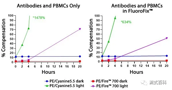 PE/Fire? 700 和PE/Cyanine5.5標記的兩種CD4抗體檢測人裂紅外周血,抗體孵育完成后在固定洗滌馬上去檢測條件下和過夜后的條件下,在5激光Cytek? Aurora 光譜流式平臺檢測,PE/Fire? 700 在不同的實驗方案中對多聚甲醛的固定具有穩(wěn)定的抗性,表現(xiàn)出比PE/Cyanine5.5更優(yōu)秀的穩(wěn)定性,但是在磷酸化指標的檢測方案中,PE/Fire? 700熒光素的穩(wěn)定性出現(xiàn)了一定程度的下降。