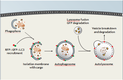 在自噬的早期,RFP和GFP信號均可被探知,當進入自噬體和溶酶體融合程序,GFP熒光信號消失,只留下可視的RFP熒光信號。GFP-LC3/RFP-LC3陽性細胞和RFP-LC3陽性細胞的比例可用來評估自噬潮的階段